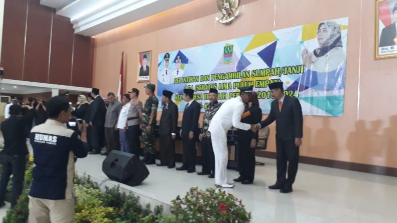 RJN, Bekasi – Bupati Bekasi, Neneng Hasanah Yasin melantik dan mengambil sumpah jabatan 154 Kepala Desa terpilih pada Pemilihan Kepala Desa (Pilkades) serentak tahun 2018 di gedung Wibawa Mukti, Komplek Perkantoran Pemkab Bekasi, Desa Sukamahi, Kecamatan Cikarang Pusat, Kabupaten Bekasi, Jumat (28/09/2018).