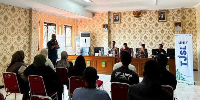 Tim PNM Cabang Bekasi memberikan sambutan dan memaparkan misi sosial PNM di hadapan warga dan pemangku kepentingan Kecamatan Tambun Utara dalam acara penyerahan bantuan TJSL.