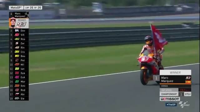 Kemenangan Marc Marquez di sirkuit Chang MotoGP Thailand, semakin mengukuhkan dirinya di puncak klasemen dengan raihan 271 poin. Sementara Andrea Dovizioso terus menempel dengan raihan 194 poin.