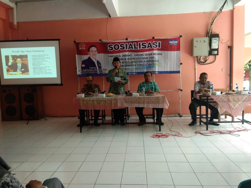 RJN, Bekasi – Anggota Fraksi Demokrat DPR RI, Hari Kartana mengajak siswa memiliki sikap bela negara dan memahami ideologi Pancasila dalam menjaga keutuhan bangsa. Hal itu disampaikan dalam kegiatan Sosialisasi Empat Pilar Kebangsaan yang berlangsung di SMK Karya Bangsa, Tridaya Sakti, Tambun Selatan, Kamis (14/3/2019).