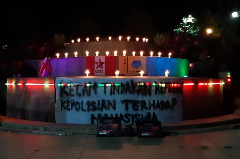 RJN, Kuningan – Puluhan mahasiswa yang tergabung dalam organisasi Pergerakan Mahasiswa Islam Indonesia (PMII) dan Gerakan Mahasiswa Nasional Indonesia (GMNI) Kabupaten Kuningan, menggelar aksi menyalakan lilin sebagai bentuk keprihatinan sekaligus kecaman atas tindakan represif oknum kepolisian saat membubarkan aksi demonstrasi di berbagai daerah.
