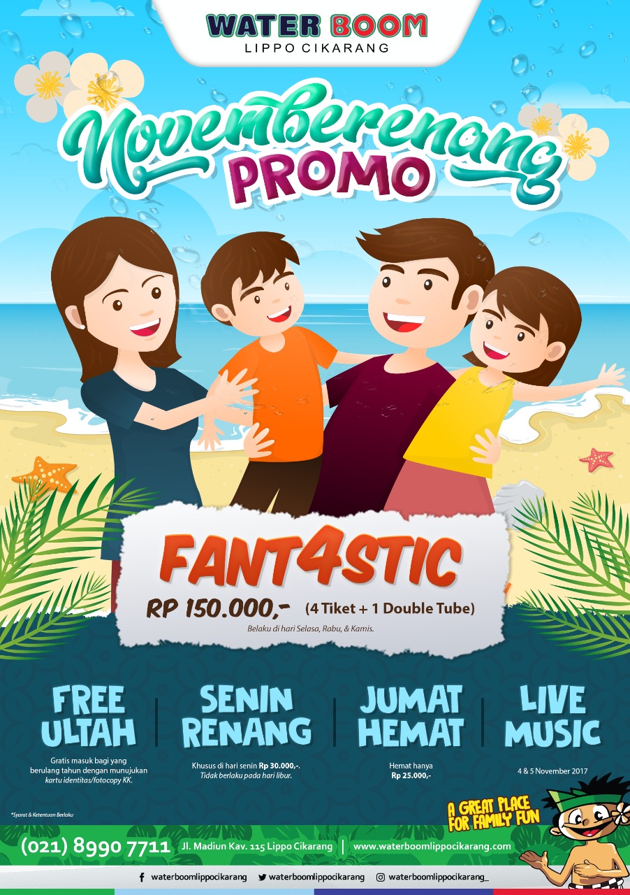 Waterbom Lippo Cikarang yang berlokasi di Jl. Madiun Kav. 115, Lippo Cikarang, Cikarang, Cibatu, Bekasi, Jawa Barat, Ada promo Fantastic 4 itu dijalankan periode 1 Oktober sampai 31 Oktober, tapi peminatnya cukup bagus jadi promo ini diperpanjang akhir November.