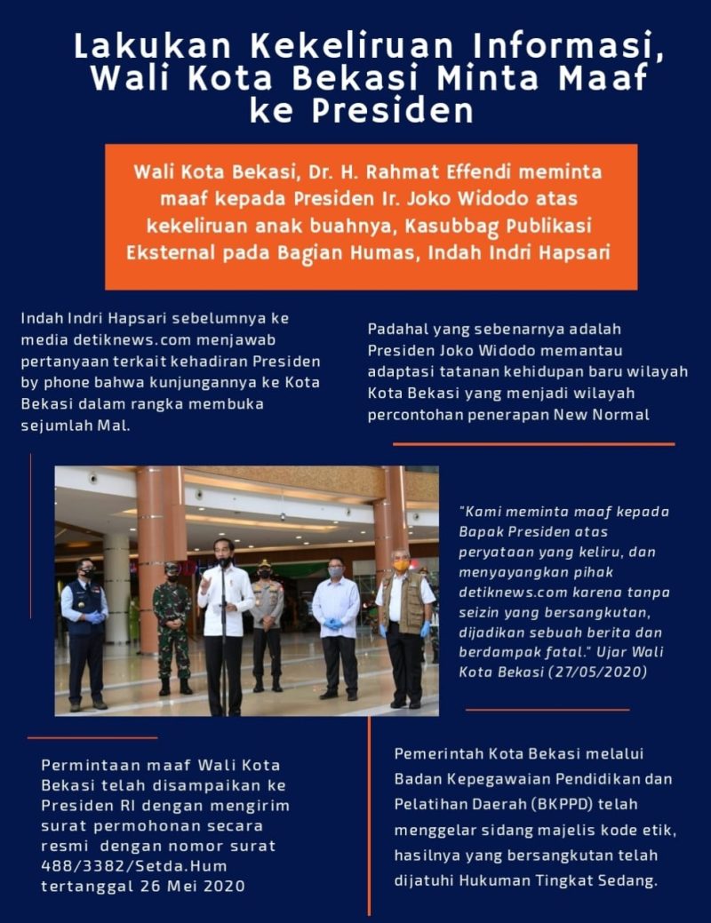 “Kami meminta maaf kepada Bapak Presiden Joko Widodo atas pernyataan yang keliru tersebut, dan menyayangkan kepada pihak detiknews.com karena tanpa seizin yang bersangkutan yaitu Kasubag Publikasi Eksternal, Indah Indri Hapsari dengan menjadikan sebuah berita dan berdampak fatal ” kata Wali Kota Bekasi Rahmat Effendi, (27/5/2020).