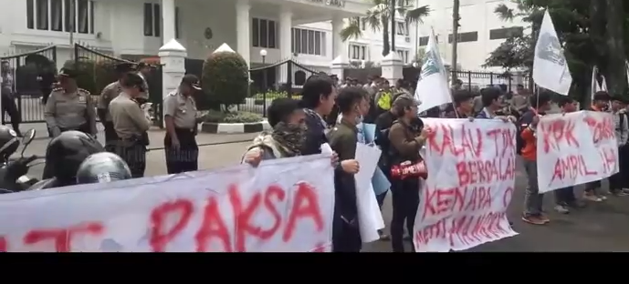 RJN, Jawa Barat– Dari sumber Tribun Jabar, spanduk besar dan kertas karton hingga bendera berlogokan KAMMI dibentangkan oleh peserta aksi. Di antaranya bertuliskan “Jemput Paksa Wagub UU”, “Kalau Tidak Bersalah Kenapa Mesti Mangkir”.