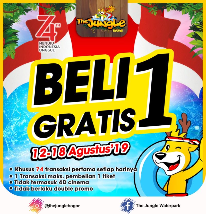 RJN, Bogor– Menyemarakan peringatan kemerdekaan Republik Indonesia ke 74, The Jungle Waterpark Bogor memberikan promo khusus Beli Satu Gratis Satu bagi 74 transaksi pertama setiap hari, periode tanggal 12 – 18 Agustus 2019. Promo ini tidak termasuk cinema 4 Dimensi.