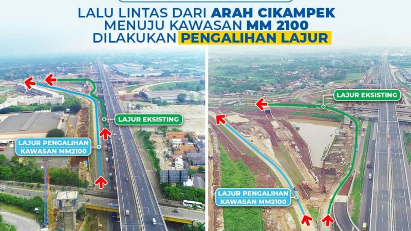 Pengalihan lalu lintas yang dilakukan adalah *pengalihan lalu lintas Jalan Tol Jakarta-Cikampek dari arah Cikampek yang menuju keluar Kawasan MM2100,* yang sebelumnya menggunakan lajur lama (eksisting) akan dialihkan ke lajur baru yg berjarak sekitar 100 m sebelum lajur lama sebagaimana yang dapat dilihat pada infografis tersebut. Pengalihan lalu lintas akan berlaku mulai besok, Jumat (27/03) pukul 09.00 WIB.