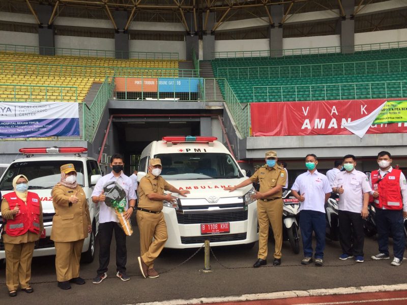 rakyatjabarnews.com, Bekasi – Pemerintah Kota Bekasi menyerahkan bantuan 2 unit mobil ambulans, 2 unit motor ambulans reaksi cepat, dan 2 unit motor operasional kepada PMI Cabang Kota Bekasi. Bantuan diserahkan langsung oleh Wali Kota Bekasi Rahmat Effendi didampingi Wakil Wali Kota Bekasi Tri Adhianto kepada Sekretaris PMI Cabang Kota Bekasi Kusnaman di Stadion Patriot Candrabhaga, Senin (20/12/2021).