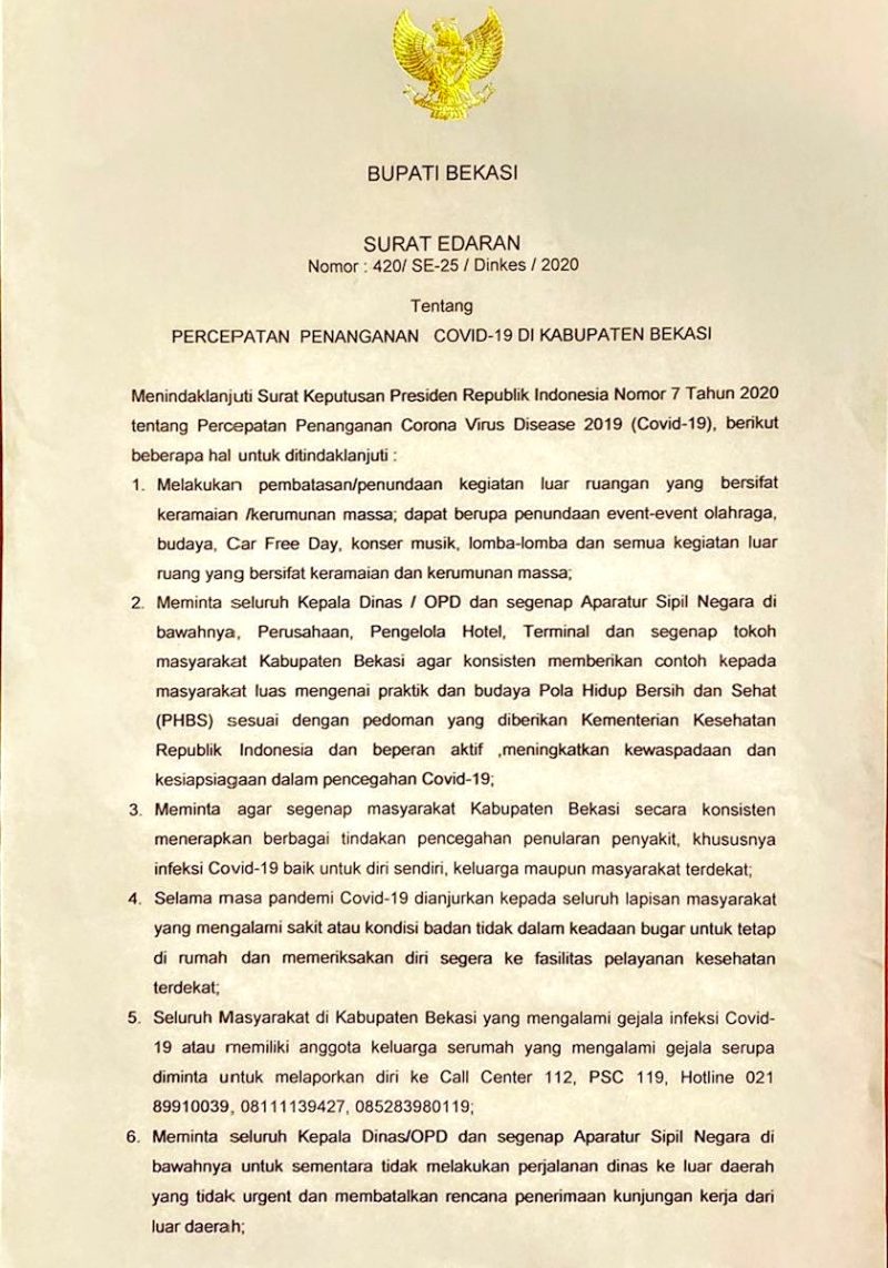 Adapun beberapa poin yang disampaikan dalam Surat Edaran Bupati Bekasi tersebut diantaranya, meminta masyarakat untuk melakukan pembatasan atau penundaan kegiatan luar ruangan yang bersifat keramaian atau kerumunan orang.