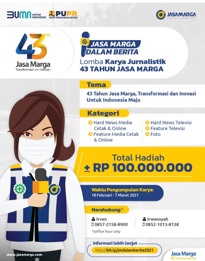 Untuk informasi lengkap mengenai lomba karya jurnalistik 2021 “Jasa Marga Dalam Berita” dapat diakses melalui tautan berikut: http://bit.ly/jmdalamberita2021