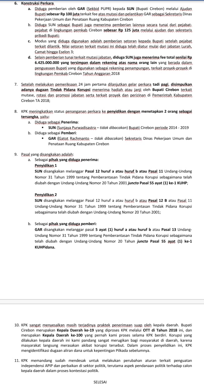 Setelah melakukan pemeriksaan selama belas jam akhirnya KPK menetapkan status kepada Bupati Cirebon dan Sekretaris Dinas Pekerjaan Umum dan Penataan Ruang sebagai tersangka pada pukul 15.30 Wib.