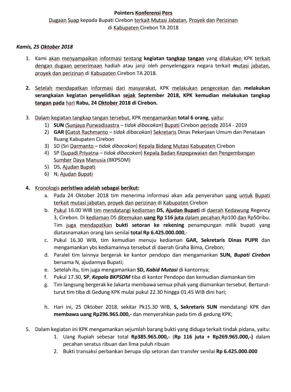 RJN, Cirebon – Desas desus adanya jual beli jabatan yang selama ini ditengah masyarakat Cirebon terjawab sudah, hasil pemeriksaan oleh penyidik KPK terhadap kasus OTT Bupati Cirebon secara gamblang di ungkap oleh salah satu wakil pimpinan KPK, Alekander Marwata dalam conference press di gedung KPK Jakarta, Kamis (25/10/2018).