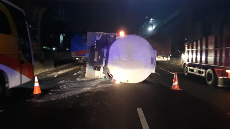 RJN, Bekasi – Kecelakaan tunggal disebabkan oleh pengemudi truk tangki milik PT Sinar Fajar yang membawa serbuk limbah batubara ini diduga mengantuk sehingga menabrak pengaman jembatan dan terguling di jalur arah Cikampek pada pukul 01.00 WIB dini hari, Jumat (6/9/2019).